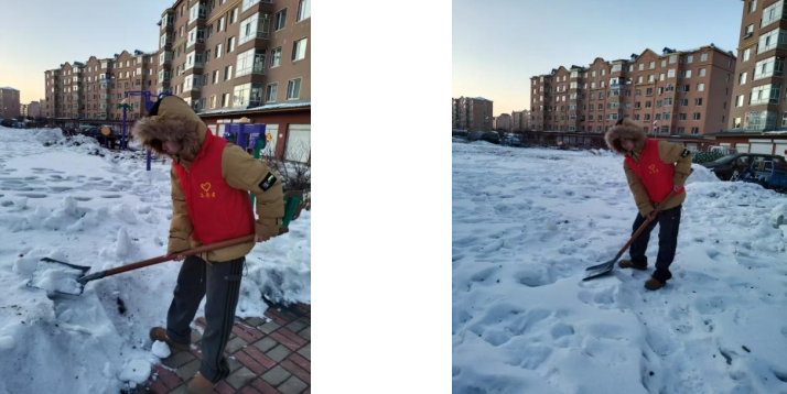 天刚破晓,小组成员就赶到社区,和其他志愿者会合。拿起铁锹,迈进齐膝深的积雪里。每铲一下,手臂都因用力而紧绷,雪在铁锹下发出“嘎吱”的声响。我们先清理人行道上的积雪,将积雪堆到一旁,再一点点拓宽路面。如若碰到结冰的地方,就只能用铁锹用力铲,冰碴四溅,溅在裤管上,寒气直透心底。清完人行道,我们又一刻不停歇地赶往居民楼下,协助搬运楼前的积雪,让住户出行再无阻碍。数小时过去,我们的脸颊冻得发紫,额角却渗满汗珠,可望着清扫整洁的街巷,倦意霎时褪去,心中盈满自豪感。