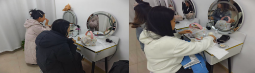 活动现场氛围热烈而温馨。在财管242班赵淼的主持下,社团骨干以日常通勤妆为切入点,细致拆解底妆服帖秘诀、眼妆层次打造、唇色精准搭配等基础技巧,用通俗的讲解让零基础的同学快速理解美妆核心逻辑。实操环节中,同学们两两分组、互帮互助,从修眉定型到打底均匀,再到眼妆晕染、唇妆点缀,一步步尝试打造专属妆容,在动手实践中消化知识点,在交流互动中增进彼此情谊。