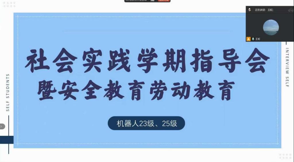 为扎实推进社会实践学期各项工作,强化学生安全意识与劳动素养。1月12日,辅导员王虹通过线上平台召开专题指导会,机器人工程专业23级、25级全体学生及生涯导师共同参会。