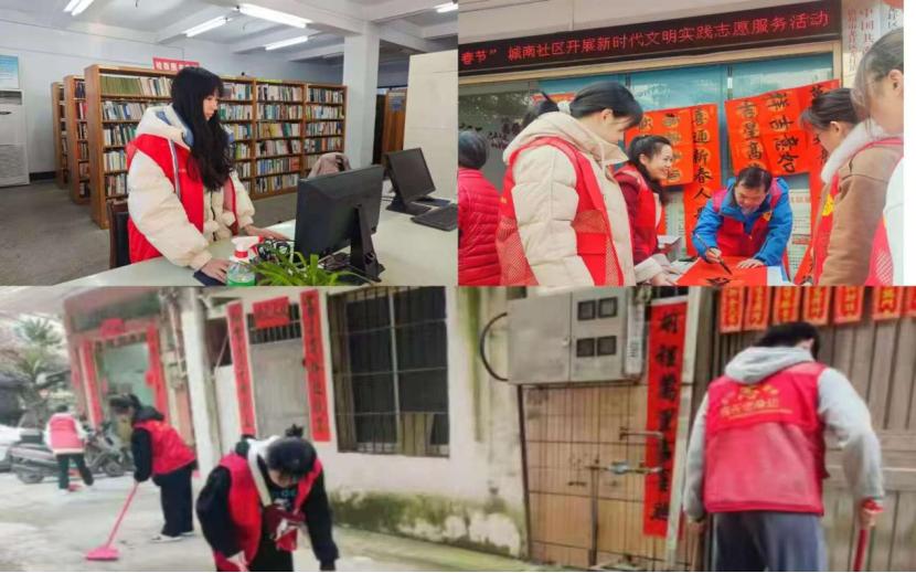 活动期间,组长赵琪与其他志愿者在图书馆整理图书、处理文档表格与各类填报信息,保障了图书馆内日常工作的高效运转;组员莫佳辉与其他志愿者分工协作,对社区居民楼周边的烟头、废纸、包装等垃圾进行全面清理,仔细搜寻草丛深处、泥土掩埋的卫生死角,不放过任何一处垃圾;组员聂炫参与“迎新春,送春联”活动,协助铺纸晾晒,配合书法爱好者为居民送上饱含新春祝福的春联,现场氛围热烈,居民们都开心的挑选心仪的春联。