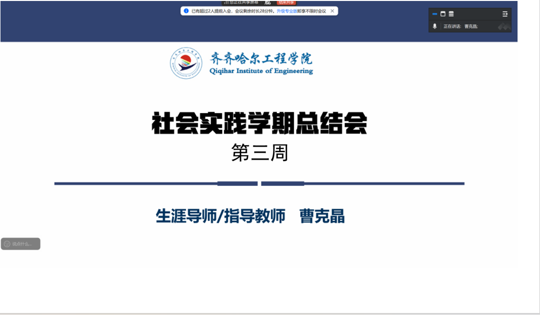 为扎实推进2025-2026学年社会实践学期各项任务,及时解决学生实践过程中的难点堵点,强化过程性指导与质量把控,机电学院曹克晶老师于1月23日通过腾讯会议召开第三周社会实践专题指导会。全体学生通过线上的方式参会,会议围绕必修项目推进情况、实操规范及问题答疑展开深入交流。