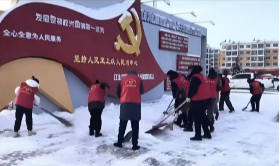 1月22日,因当日暴雪,社区主干道和单元楼出入口出现积雪结冰现象,严重影响居民出行。jx2026010组成员敖嘉军与其他志愿者分工协作,手持铁锹和雪推板,先对老人出行高频路段进行清理,再逐片铲除主干道的积雪,同时撒布融雪盐以防止路面结冰。在这一过程中,敖嘉军主动帮扶行动不便的老人安全通行,并协助商铺清理门前积雪。