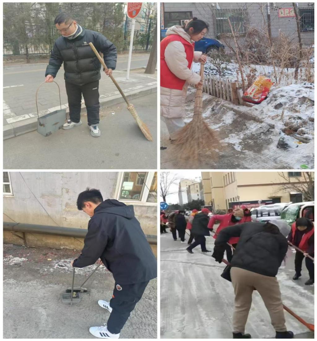 实践过程中,学生们分工明确、干劲十足:有的手持扫帚、簸箕,细致清扫路面的纸屑、杂物,不放过角落的卫生死角;有的用铲雪工具清理路边残留的积雪与薄冰,避免行人滑倒;还有的学生协助社区工作人员登记环境清理进度,同时向路过居民宣传“爱护环境、文明出行”的理念。面对寒风与脏污,大家没有丝毫懈怠,相互配合完成了社区主干道、公共区域的垃圾清扫与积雪处理,让原本略显杂乱的路面变得整洁通畅。