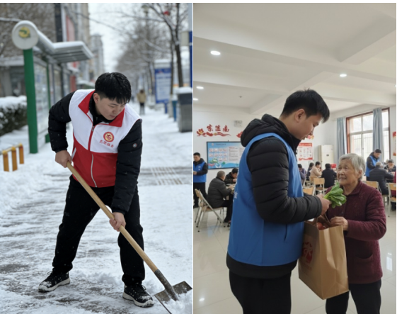 苗子轩同学参与城市道路清雪志愿服务,在降雪后的街道手持铁锹清理路面积雪。面对湿滑难铲的积雪,他不畏严寒、埋头实干,为市民出行打通安全通道,用青春力量守护城市温暖。