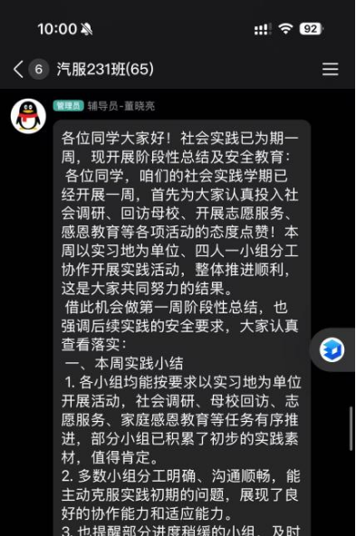此次线上班会不仅梳理了实践成果、明确了后续方向,更强化了同学们的安全责任意识,为汽服231班社会实践活动的顺利推进奠定了坚实基础。同学们纷纷表示,将认真落实班会要求,在保证安全的前提下,高质量完成后续实践任务。