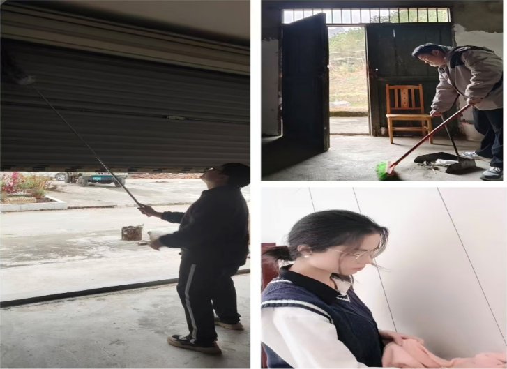 活动过程中,小组成员们主动承担了多项劳动任务。有的同学在自家门口,手持长杆仔细清理卷帘门缝隙中的灰尘与杂物,反复擦拭门体表面,让长期使用的卷帘门恢复整洁;有的同学回到老家旧屋,拿起扫帚和簸箕,对积灰的地面进行彻底清扫,将墙角、门后的垃圾一一清理干净。此外,小组其他成员也在家中参与了家务劳动,有的负责厨房油污清洁,有的承担衣物整理收纳,有的协助长辈完成劳动工作,在日常劳作中践行劳动精神。