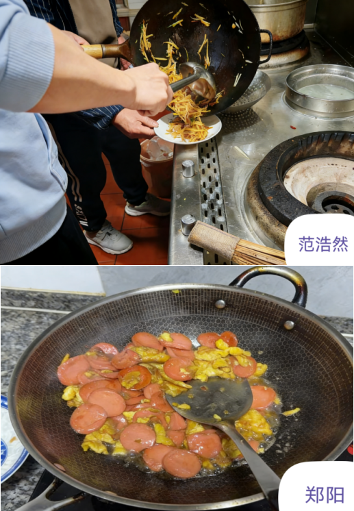 清晨,当窗外还飘着细碎的雪粒,小组成员郑阳就系上围裙,在自家厨房忙碌起来。首先将火腿肠切成均匀的薄片,在热油中与金黄的蛋液一同翻炒,滋滋作响的香气唤醒了整个清晨。另一边,范浩然正专注地为父母准备酸辣土豆丝,学着餐馆厨师的样子颠锅翻炒,让土豆丝在铁锅里翻飞,醋香与辣意交织成独特的烟火气。还有成员选择了更复杂的菜式,从备菜到调味都亲力亲为,当一盘盘热气腾腾的饭菜端上餐桌时,父母眼中的欣慰与笑意,成了最动人的风景。大家在线上群里分享着各自的成果:有人感慨“原来妈妈每天做饭这么辛苦”。