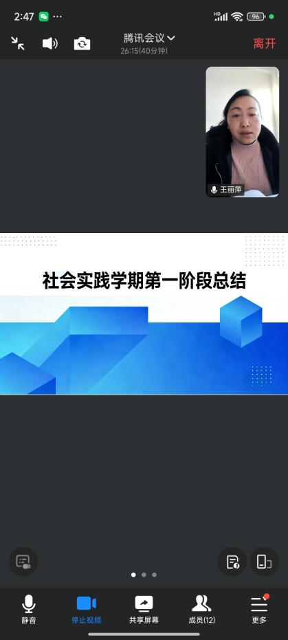 1月15日,王丽萍老师召开社会实践学期第一阶段总结的会议,所有同学按时参加此次会议。