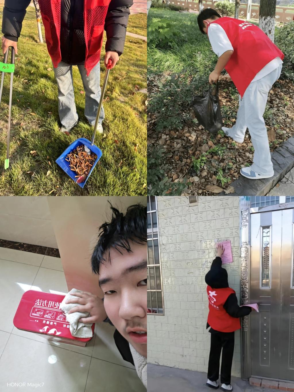 1月8日,jx2026060组的申欣然、杜加文、杨浩、焦和森四位同学分别在家乡主动投身志愿服务。他们扎根家乡基层,结合当地需求奔走在服务一线,用行动为家乡发展添力,在邻里间传递温暖。大家各司其职,认真做好每一项服务工作,耐心对待每一位乡亲,以实际行动诠释青年担当。
