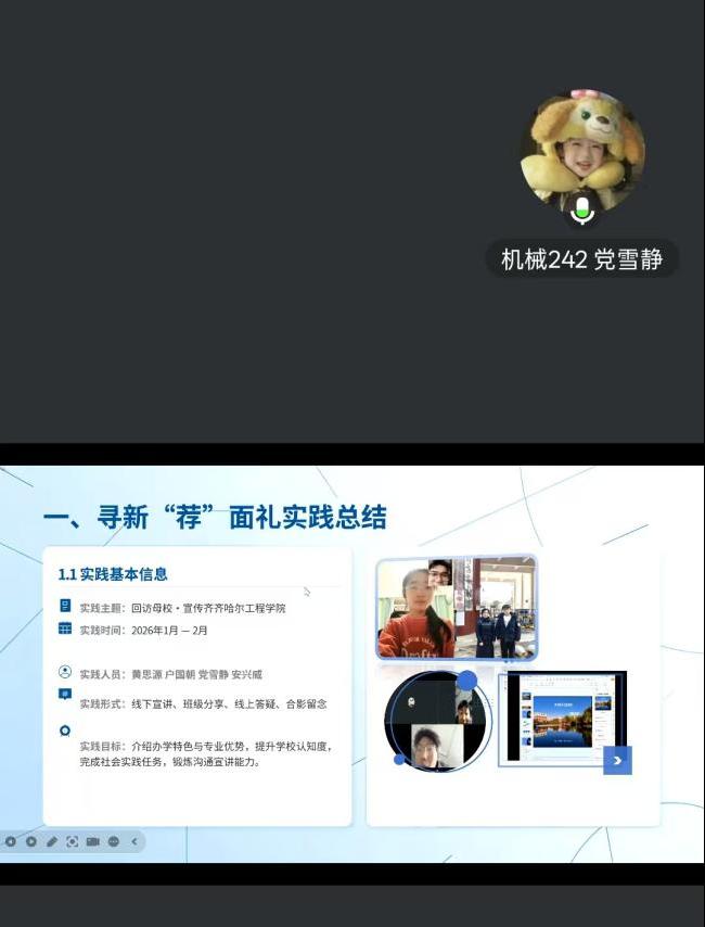 会议过程中,同学们细致梳理实践成果、深刻反思学习短板,精准明确了后续专业学习的进阶方向,充分展现出朝气蓬勃、严谨务实的优良学习风貌。此次线上工作总结,不仅全方位复盘了整个实践学期的学习历程,也帮助同学们巩固专业所学、精准查漏补缺,实现了理论认知水平与实践操作能力的同步进阶。