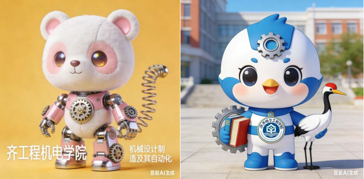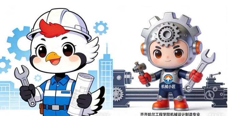 为学校设计的吉祥物“齐小程”,身着印有校徽的工装,手持扳手与图纸,背景融入学校标志性建筑,尽显工程学子的朝气与务实;专业吉祥物“机小匠”则以机甲为造型,头部齿轮、机械臂等元素紧扣专业特色,萌趣外形与硬核机械元素的碰撞,诠释了“严谨又温暖”的专业气质。