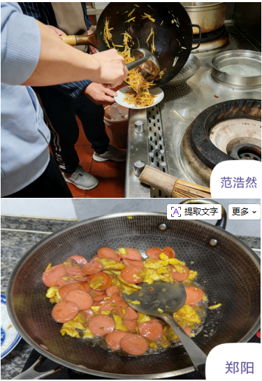 清晨,当窗外还飘着细碎的雪粒,小组成员郑阳就系上围裙,在自家厨房忙碌起来。首先将火腿肠切成均匀的薄片,在热油中与金黄的蛋液一同翻炒,滋滋作响的香气唤醒了整个清晨。另一边,范浩然正专注地为父母准备酸辣土豆丝,学着餐馆厨师的样子颠锅翻炒,让土豆丝在铁锅里翻飞,醋香与辣意交织成独特的烟火气。还有成员选择了更复杂的菜式,从备菜到调味都亲力亲为,当一盘盘热气腾腾的饭菜端上餐桌时,父母眼中的欣慰与笑意,成了最动人的风景。大家在线上群里分享着各自的成果:有人感慨“原来妈妈每天做饭这么辛苦”。