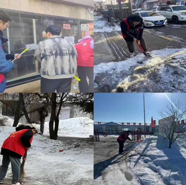 本次志愿服务主要开展清理小广告和社区扫雪除冰两项工作。活动中,四位学生分工协作、配合有序,对社区楼道、墙面、电线杆上的小广告进行集中清理,对社区主干道、单元门口、人行步道的积雪进行清扫铲除,大家不畏严寒、干劲十足,将积雪集中堆放,保障居民出行安全。两项工作同步推进,学生不怕冷、不怕累、不怕脏,圆满完成了本次志愿服务任务。