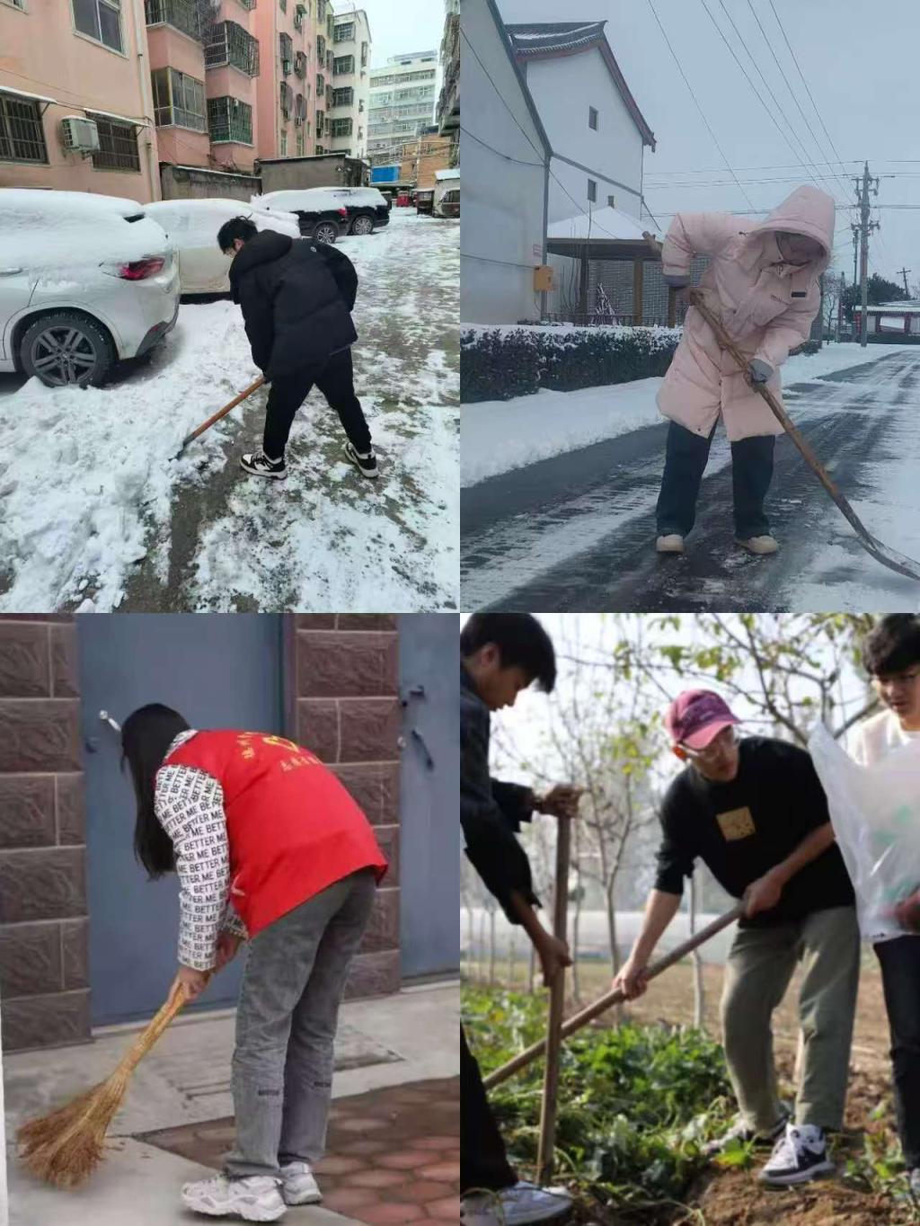 下雪后,卞艺名和朱贺在各自家乡社区的道路上拿着铁锹、雪铲,在小区和路边清理积雪,方便大家出行。为居民和行人开辟出安全畅通的道路,保障了大家的出行安全。在社区门口,申杨用扫帚清扫地面,认真清扫地面的灰尘和杂物,不放过任何一处卫生死角,用双手让社区环境变得更加整洁有序,营造了干净舒适的生活空间。在田间地头,李润涛和其他志愿者参与农事劳作,用农具清理杂草和作物残株,翻整土地。大家俯身劳作,用实际行动助力乡村生产,为乡村发展贡献青春力量。