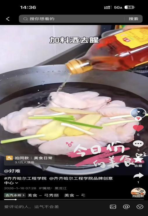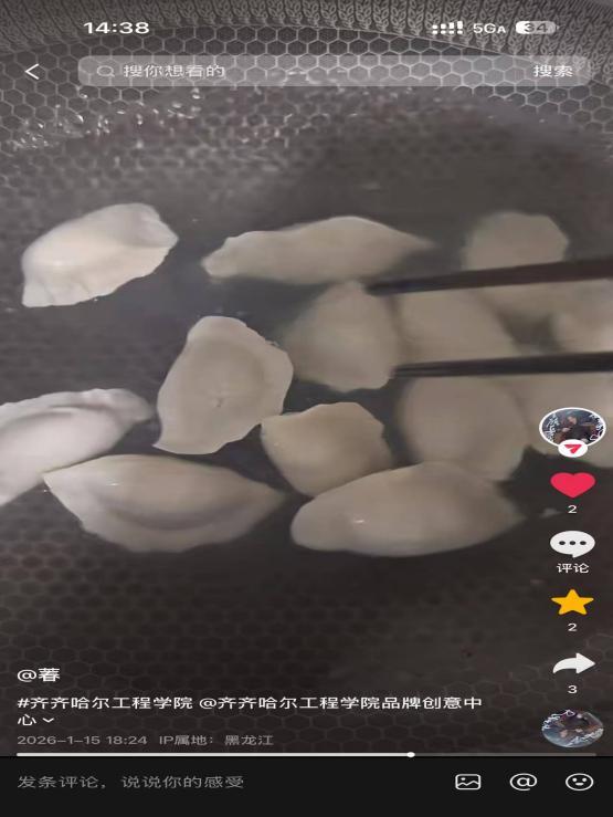 寒假期间,cl2026035组同学积极参与抖音平台青春美食主题创作活动,他们分别亲自下厨,做了可乐鸡翅、煮饺子、鸡蛋炒饭,三样参赛作品。此次抖音青春美食活动以“青春食光,百味皆甜”为核心,鼓励青年用短视频记录美食制作、家乡特色美味、创意轻食等内容。创作过程中,cl2026035组同学精心构思视频脚本,巧妙运用运镜、配乐、字幕等技巧,将美食的色香味形与青春的鲜活朝气相融合,每一条短视频都构思新颖、画面生动。