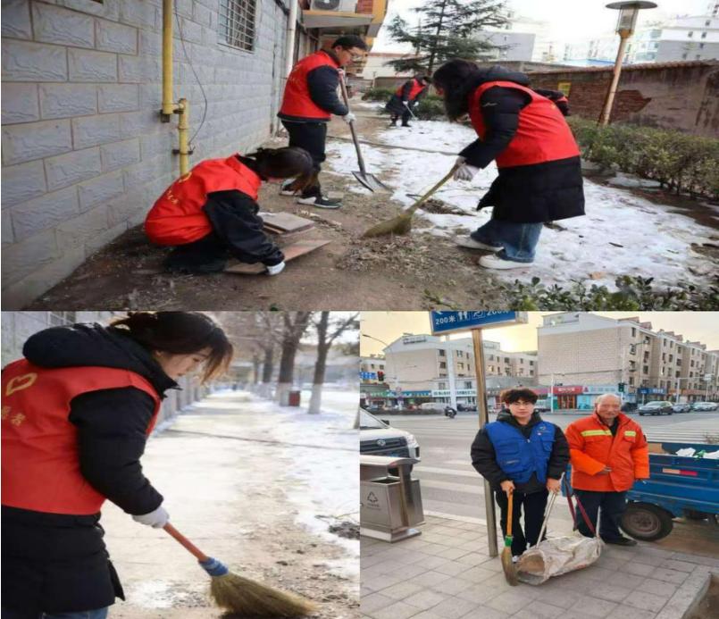 Cl2026050组成员在贾文静老师的组织下,按时完成了志愿活动。他们不畏严寒,手持铁锹、扫帚等工具,分工协作清理路面积雪,铲除路边杂物,清扫街巷垃圾。志愿者们蹲身捡拾杂物,挥帚清扫路面,并且主动与环卫工人交流协作,共同维护社区整洁。经过青年志愿者们的辛勤劳作,社区道路积雪被清除,街巷环境焕然一新,为居民出行营造了安全、洁净的环境,用实际行动诠释了青年志愿者的奉献与担当。
