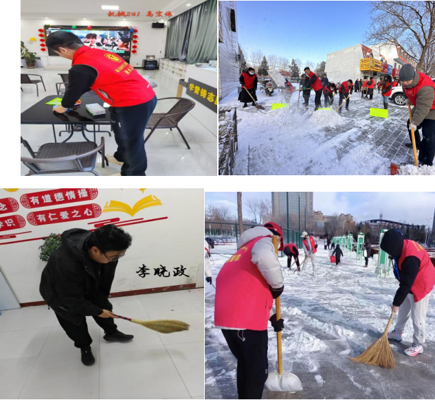 操场上,马宁同学和郭雨同学正在除雪;李晓政正蹲在社区宣传栏前,打扫蒙尘的公告板,高宏伟同学打扫社区之家。