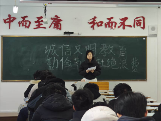 会上,王虹老师对五项重点内容作出具体部署。诚信教育方面,强调学业与言行一致,树立契约精神,做人做事讲诚信,考试诚信就餐诚信树立大学生诚信的意识。文明日常教育方面,明确师生交往礼仪,校内所有教职工一律尊称“老师”,校园内主动问好;寝室熄灯后严禁打游戏、吸烟、外放视频等行为,由寝室长牵头制定公约,落实“寝室即家庭”自治原则。节约粮食方面,坚持“吃多少、取多少”,统一在指定食堂就餐,夹菜“看准再取”,杜绝反复翻拣、挑拣食物。节水节电方面,杜绝长明灯、长流水。杜绝浪费方面,全面反对各类浪费行为,珍惜免费餐食,积极参与学校节水、节电、节粮系列打卡实践活动,相关工作已纳入专项工程文件。此外,王虹老师还就禁止乘坐电梯、卫生检查、不能说脏话等作出具体要求争做文明大学生。