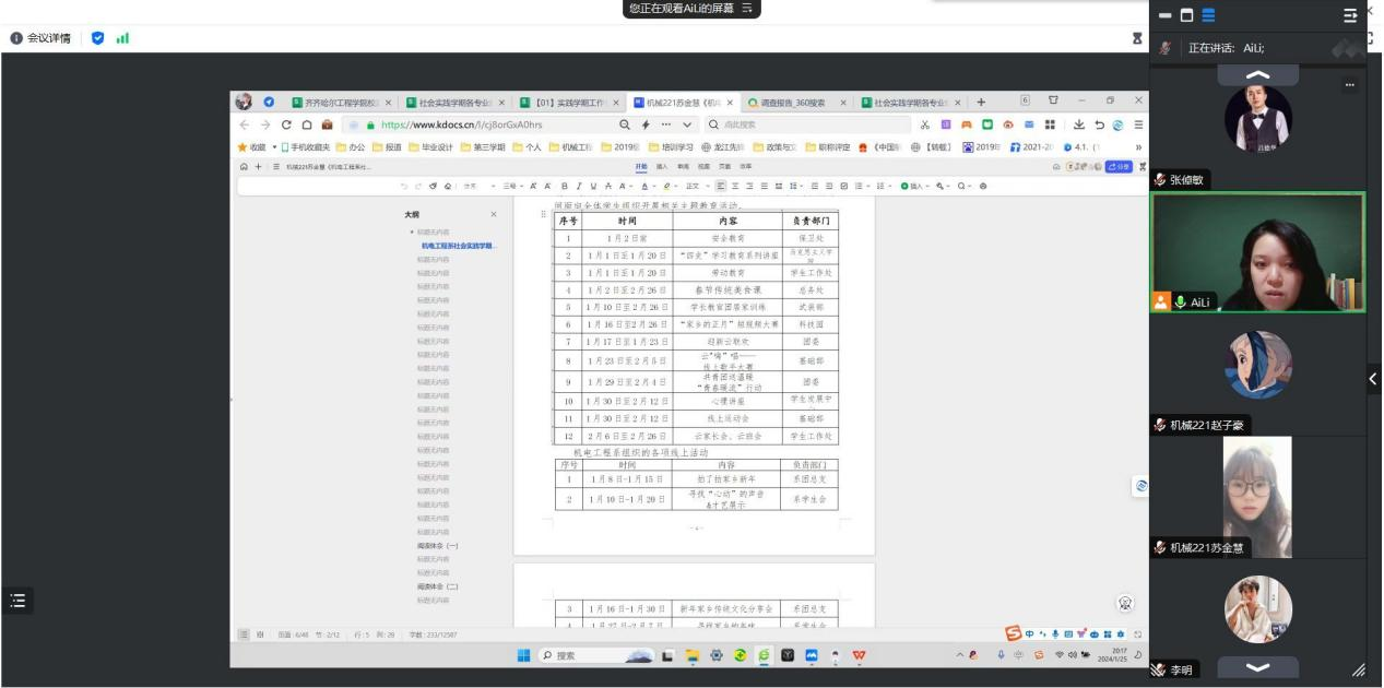 本周通过线上会议的形式,对各小组的任务完成情况进行了深入的了解与分析,并对同学提出的问题进行深度解答。1月25日,高爱利老师召开了社会实践学期第三周总结会。高爱利老师重点强调社会实践学期对于同学们的重要性,她希望通过本次会议,能让同学们更好的完成接下来的社会实践任务。