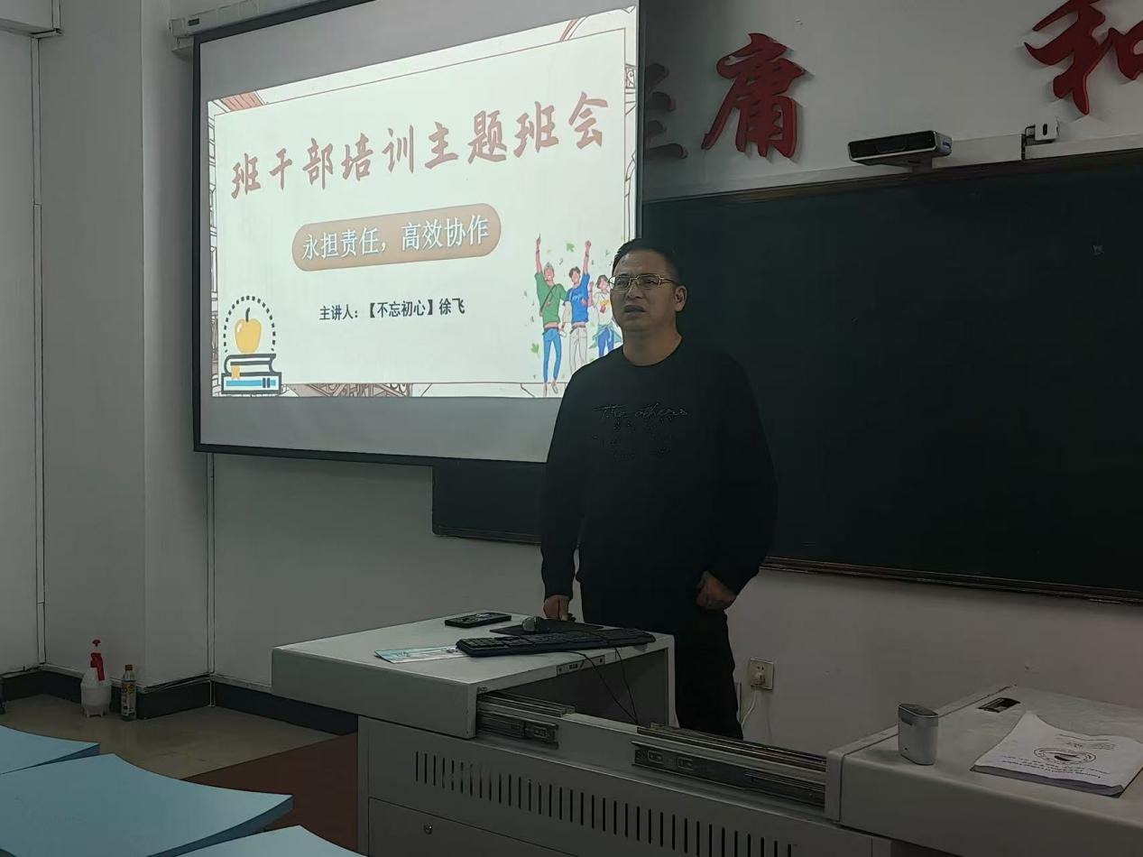 针对“如何做好班干部”这一核心问题,徐飞老师结合实际场景给出具体方法。他强调,学习是班干部的第一要务,需提前规划时间,平衡好工作与学习的关系;要先提升自我,在学习和生活中做到自律自强,以“服众”的榜样魅力赢得同学认可;更要主动学习工作方法,心怀班集体、注重团结合作,通过差异化沟通化解矛盾,确保班级事务高效推进。此外,徐飞老师还详细拆解了班长、学习委员、生活委员、课代表、团支书等岗位的具体职责,让每位班干部清晰知晓自身任务,同时明确列出“杜绝懒惰敷衍、避免马虎浮躁、摒弃不自律”等禁忌行为,为班干部履职划定“红线”。 培训尾声,徐飞老师鼓励全体班干部以责任感为帆,以实干为桨,携手打造有活力、有温度的班集体。
