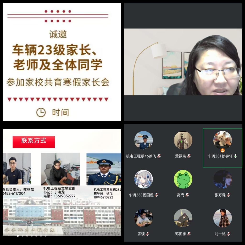 1月24日晚,机电系辅导员徐飞老师通过腾讯会议平台主持召开了车辆23级“云家长会”,车辆23级全体学生及家长在线参加。会议围绕学业情况分析、微专业政策解读、学校育人理念及新学期要求等方面展开,旨在凝聚家校合力,引导学生积极备战补考,规划学业发展。