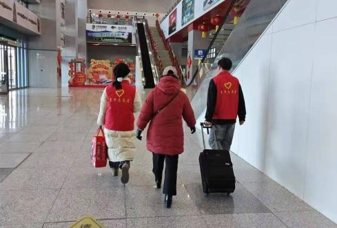 活动中,他们身穿红马甲,在站台、车厢门口等区域提供引导服务。他们主动帮助旅客搬运行李,协助人群安全乘车,耐心解答乘车问询。无论是为返乡务工人员扛运行李,还是为独自出行的老人提供指引,志愿者们都细致周到,用热情的服务温暖了旅客的回家路。
