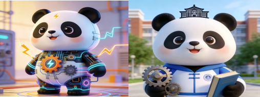 校园吉祥物创作中,成员边蕴辉输出核心创意,将校徽、校训融入设计,熊猫身着印校徽的蓝色校服,手持书本钢笔,脸颊带红晕;成员周善权运用AI 工具优化,使其更灵动。电气专业吉祥物方面,组长苏靖凯提出“科技感与可爱风融合”,熊猫头顶带电路纹理小天线,胸前有专业能量徽章,四肢有电流纹路。四人分工,成员冯阳检索整合素材,周善权优化色彩,边蕴辉完善细节,苏靖凯审核符号准确性,最终通过 AI 生成、手动精修完成终稿。