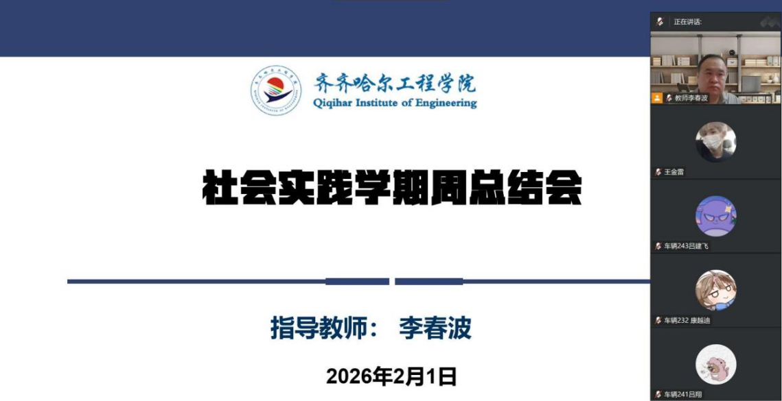 为全面梳理社会实践学期各阶段任务完成情况,确保实践成果的高质量交付,指导老师李春波于2月1日晚召开社会实践学期周总结会。会议由全体社会实践小组组长及组员学生参加。