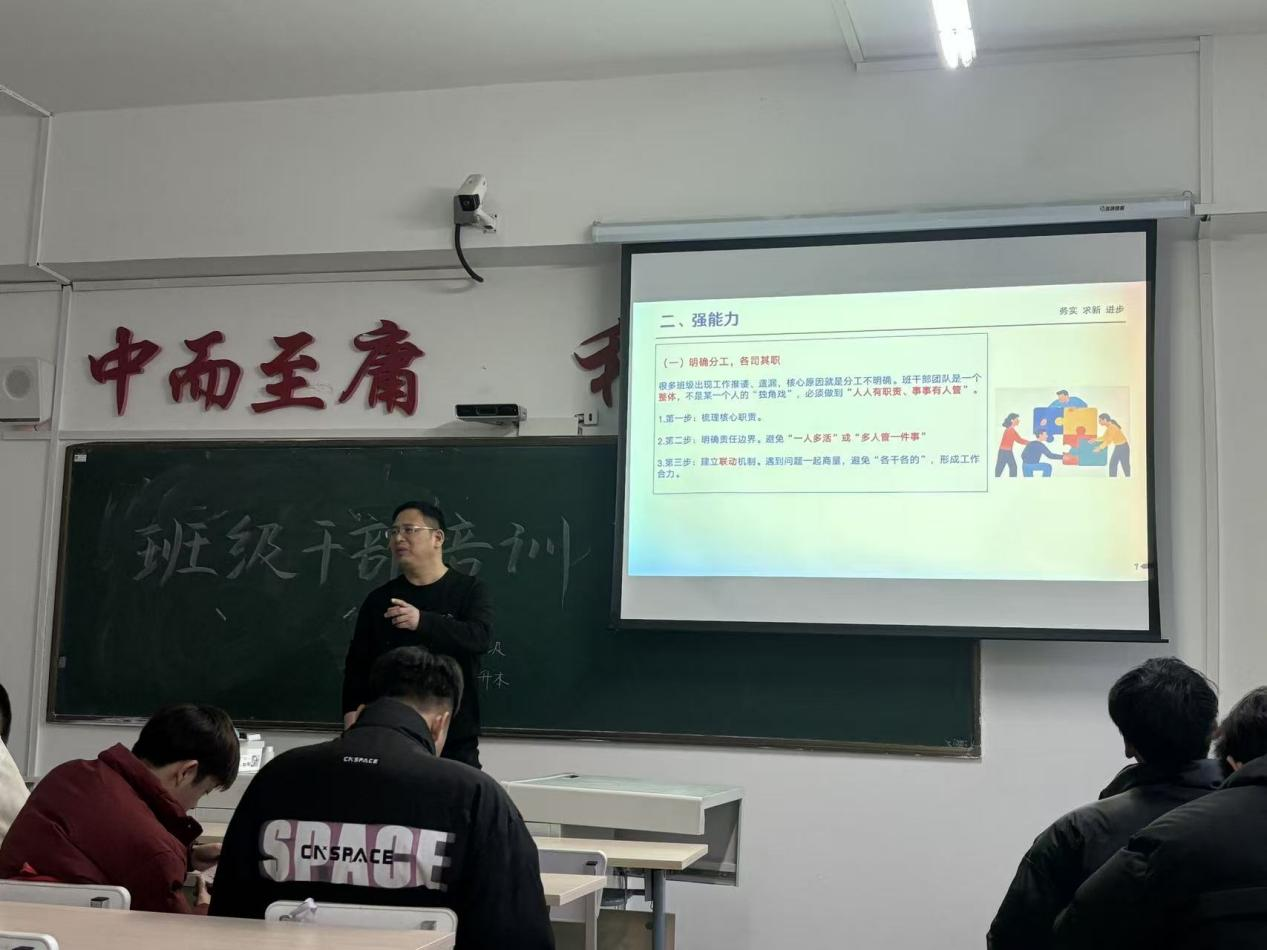 培训中,辅导员老师徐飞首先明确班干部“服务”“引领”的核心价值,从引领、凝聚、示范、沟通四个维度阐释履职意义,要求班干部树立大局意识,做到心中有班级、心中有同学。在能力提升环节,强调班干部团队要明确分工、高效沟通、强化协作、锤炼引领本领,打造“人人有职责、事事有人管”的工作格局,学会在辅导员与同学间搭建沟通桥梁。同时,徐飞老师要求班干部以勤沟通筑牢信任根基,主动对接问题、定期反馈工作、虚心接受意见。此外,明确品德是班干部履职根本,需坚守正直诚信底线,以身作则传递正能量,营造优良班风学风。